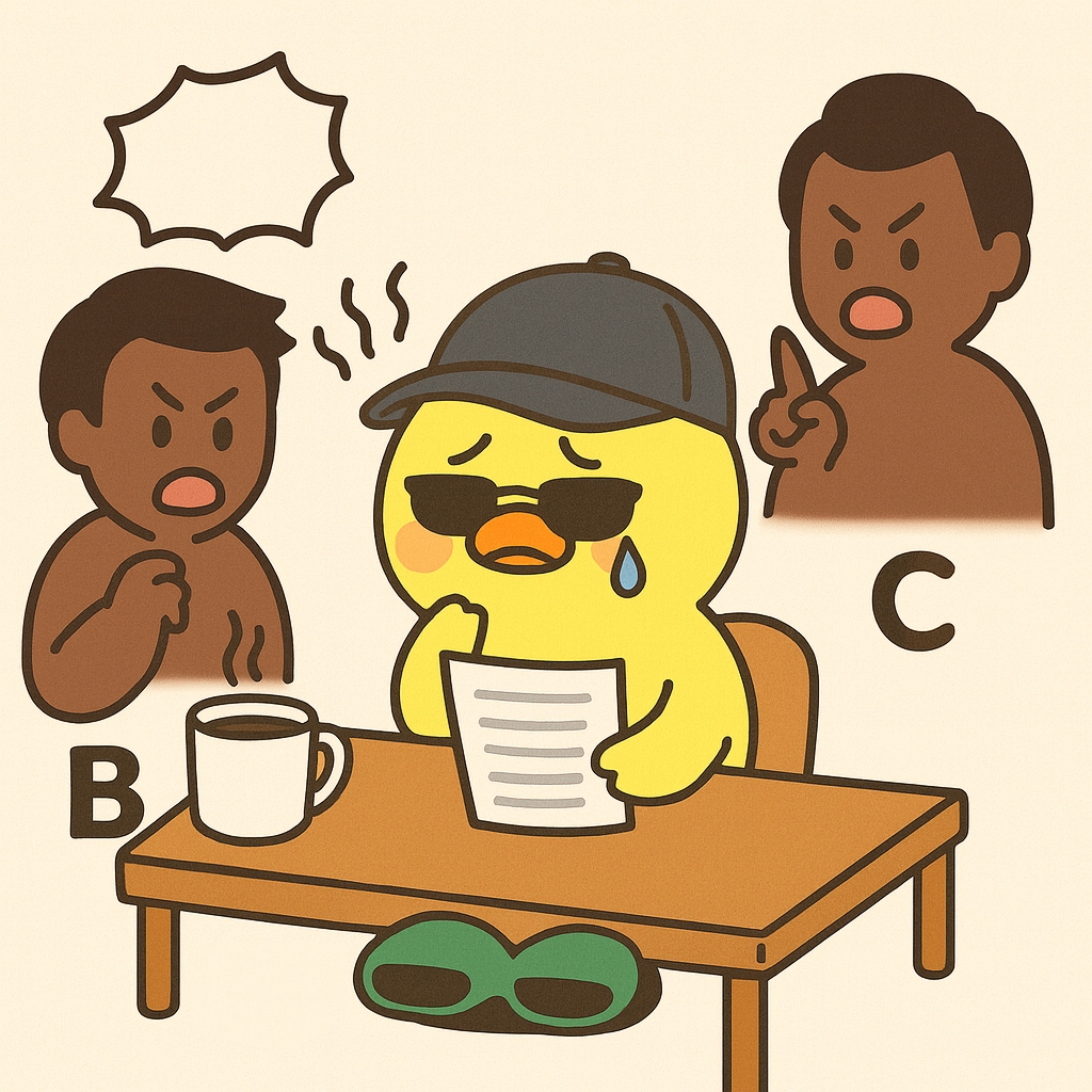 なぜ、上司C=アドバイザーがいるのかはわかりません。同僚Bと上司Cの関係もよくわからない。